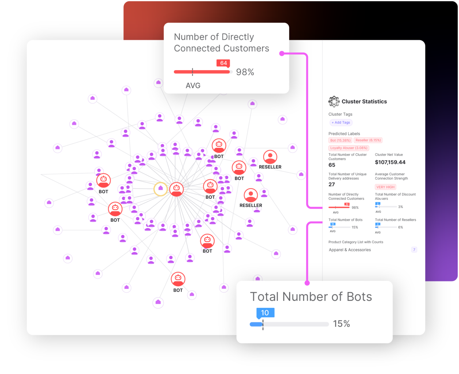 Spot fraudulent accounts and masked identities using device, network, and telemetry patterns to match them to the same user or cluster.