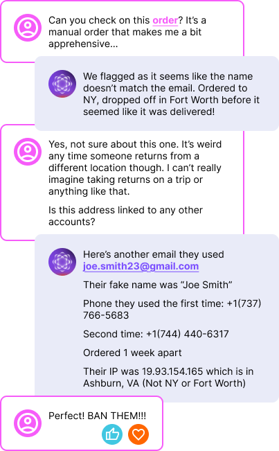 This conversation shows us explaining a pattern by which the customer details, timing of return, and return location indicate a coordinated or repeat return fraud effort.